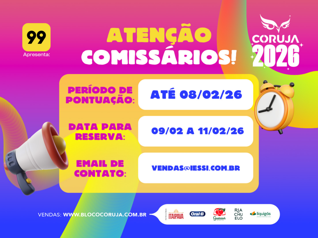 O Bloco Coruja se reserva o direito de estabelecer as datas de início e término para vendas dos comissários;